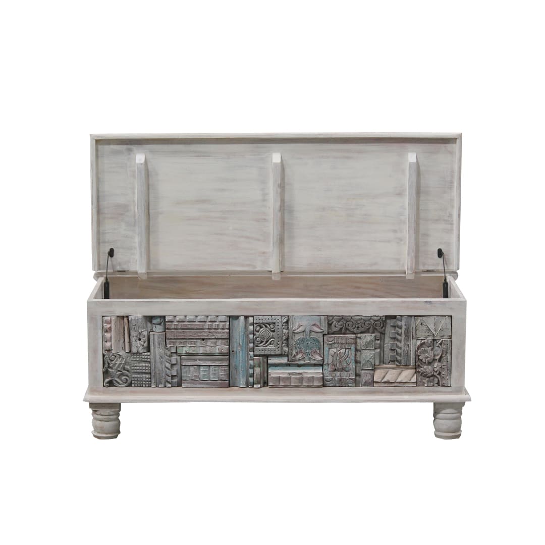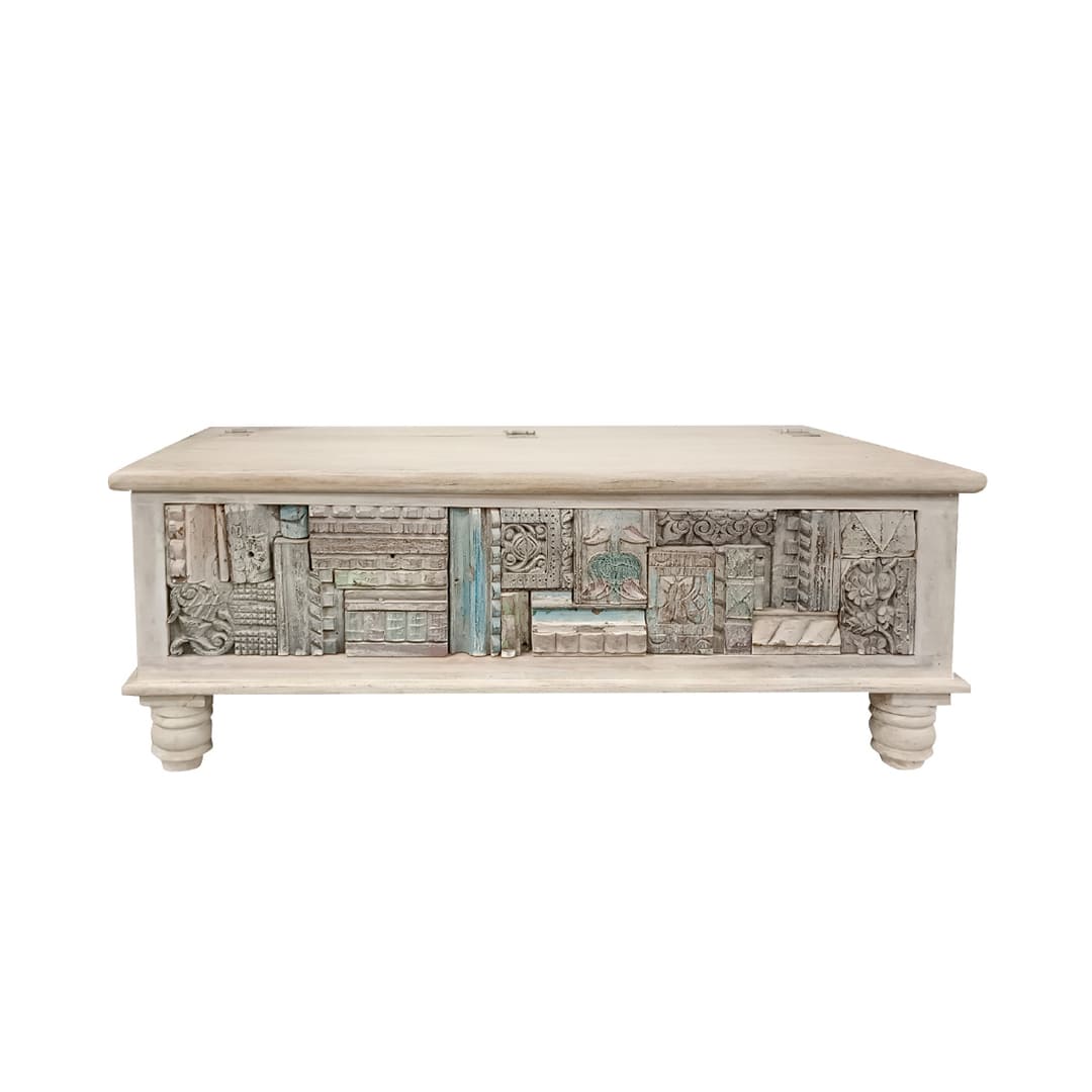 Material madera mango. Color beige wash, diseño tipo puzzle con detalles de color, acabado decapé. Herrajes en hierro. Tallado a mano, diseño único típico de la cultura.