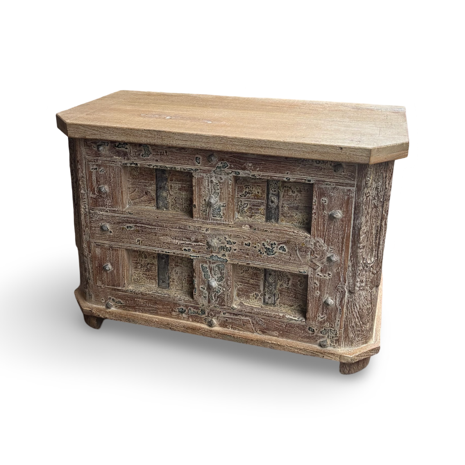 Material madera mango. Color madera natural a la vista con blanco wash, apliques repujados en metal, acabado decapé. Herrajes en hierro. Tallado a mano, diseño único típico de la cultura.